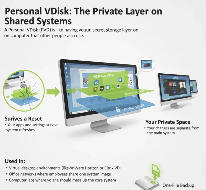 Imagine a school lab. Every student logs in. If one changes the wallpaper, everyone else sees it too, unless there is a personal layer. A personal VDisk keeps your changes separate from the main system.